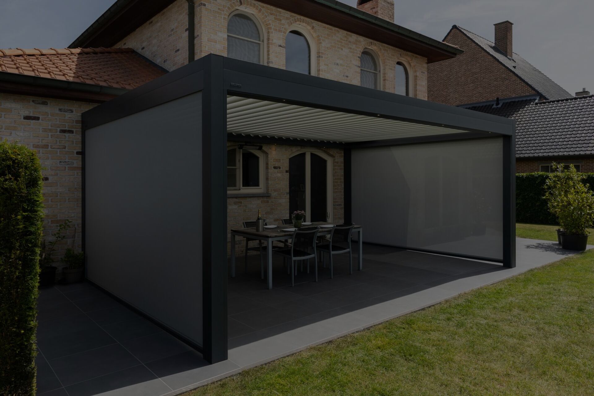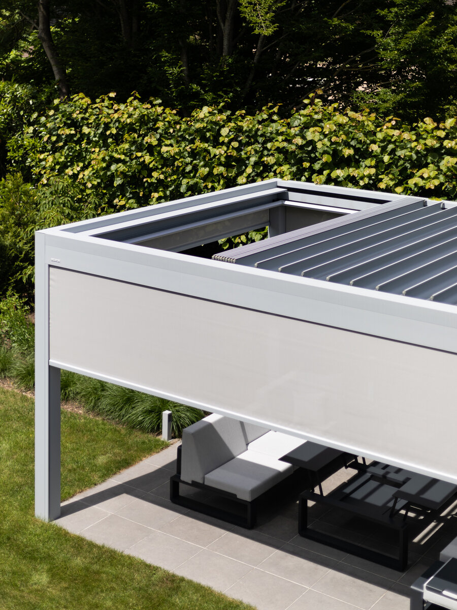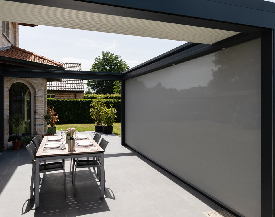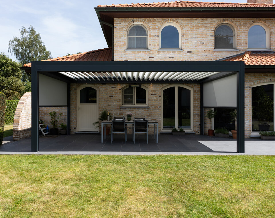 Die elegante Terrassenüberdachung mit dem Lamellendach B600 S ist der ideale Sonnenschutz. Die Lamellen können fast vollständig geöffnet werden. Im Frühjahr wie im Herbst kann man so von einem optimalen Lichteinfall genießen, drinnen wie draußen. Herbsttage können schon wechselhaft sein, mit viel Sonne, wenig Sonne oder sogar ein kleiner Regenschauer. Die B600 S passt sich das ganze Jahr über an persönliche Vorlieben an. Dank der integrierten Screens bietet das Modell B600 S einen optimalen Schutz.